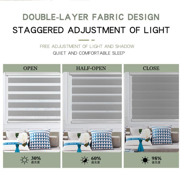 Dual-layer fabric structure allows easy adjustment of brightness, view, and privacy levels with a single motion — no need for separate curtains or shades.